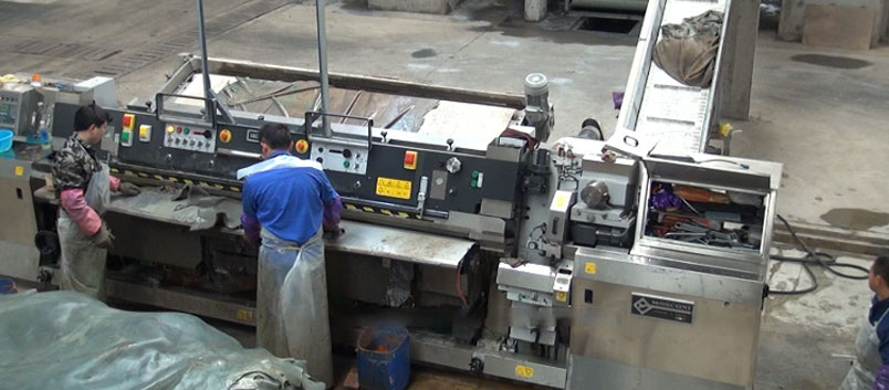 3. The conveying line is used for expanding the skin into the drum and conveying meat dregs After removing the meat, the skin automatically slides to the conveying line (due to the different tanneries’ technology, some tanneries add an automatic conveying platform here for trimming),After the conveyor line is automatically weighed, it is sent to the designated drum for ash dipping and expansion. The meat dregs scraped from the skin are sent to the meat dregs press by the meat dregs conveying line.