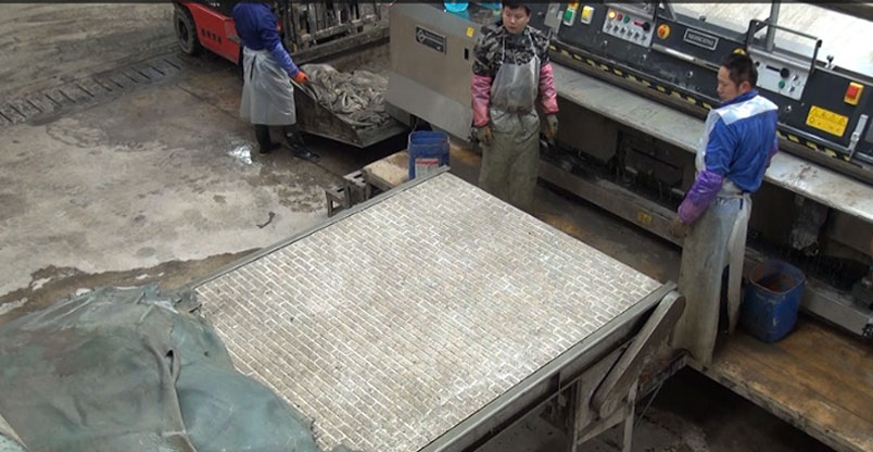5. Conveying platform After the liming skin is removed, it will fall onto the conveying platform automatically. The operator will finish trimming and stacking the leather. The neatly stacked liming skin will be transported to the workbench of the cutting machine, and the operator will conduct the cutting of the leather.